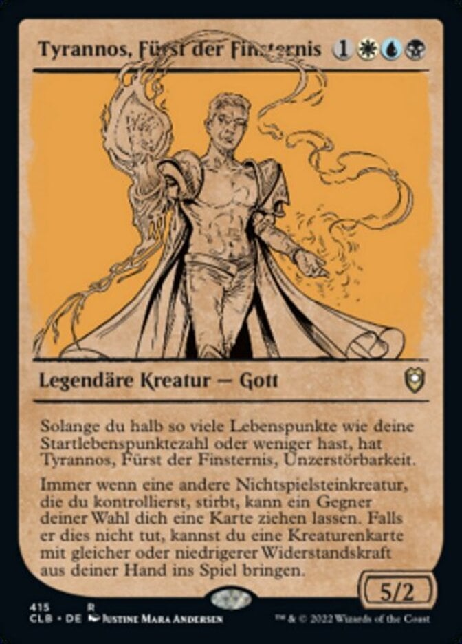 | Rules | As long as your life total is less than or equal to half your starting life total, Bane, Lord of Darkness has indestructible. Whenever another nontoken creature you control dies, target opponent may have you draw a card. If they don't, you may put a creature card with equal or lesser toughness from your hand onto the battlefield. |