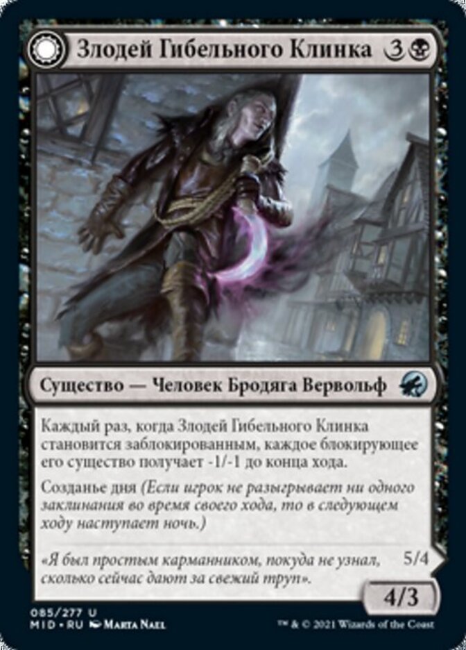 | Rules | Whenever Baneblade Scoundrel becomes blocked, each creature blocking it gets -1/-1 until end of turn. Daybound (If a player casts no spells during their own turn, it becomes night next turn.) // Whenever Baneclaw Marauder becomes blocked, each creature blocking it gets -1/-1 until end of turn. Whenever a creature blocking Baneclaw Marauder dies, that creature's controller loses 1 life. Nightbound (If a player casts at least two spells during their own turn, it becomes day next turn.) |