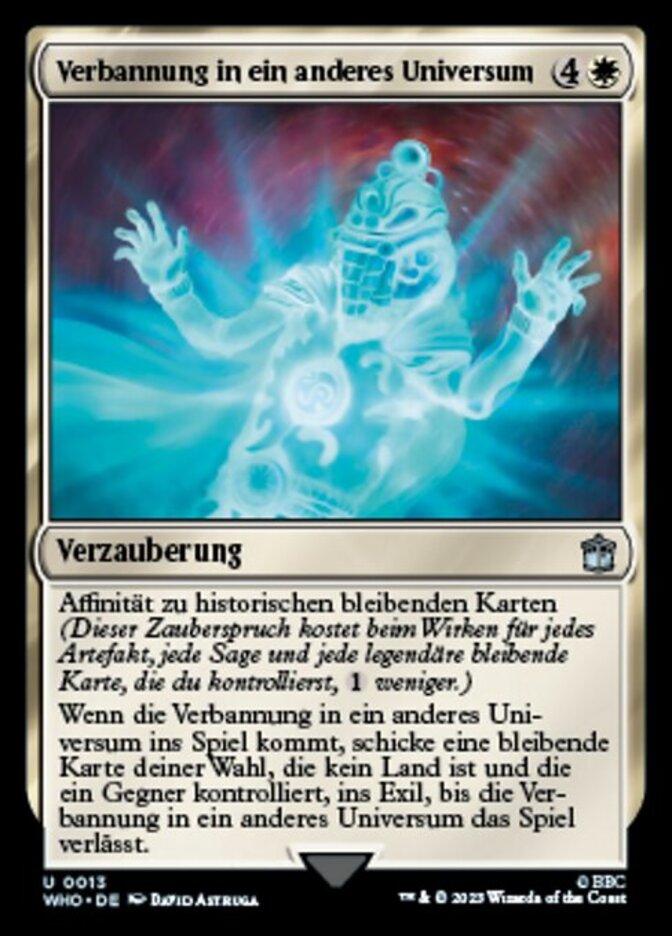 | Rules | Affinity for historic permanents (This spell costs less to cast for each artifact, legendary, and/or Saga permanent you control.) When Banish to Another Universe enters the battlefield, exile target nonland permanent an opponent controls until Banish to Another Universe leaves the battlefield. |