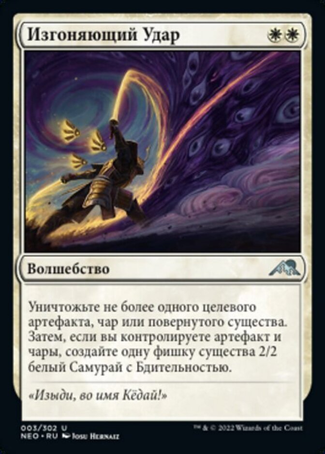 | Rules | Destroy up to one target artifact, enchantment, or tapped creature. Then if you control an artifact and an enchantment, create a 2/2 white Samurai creature token with vigilance. |