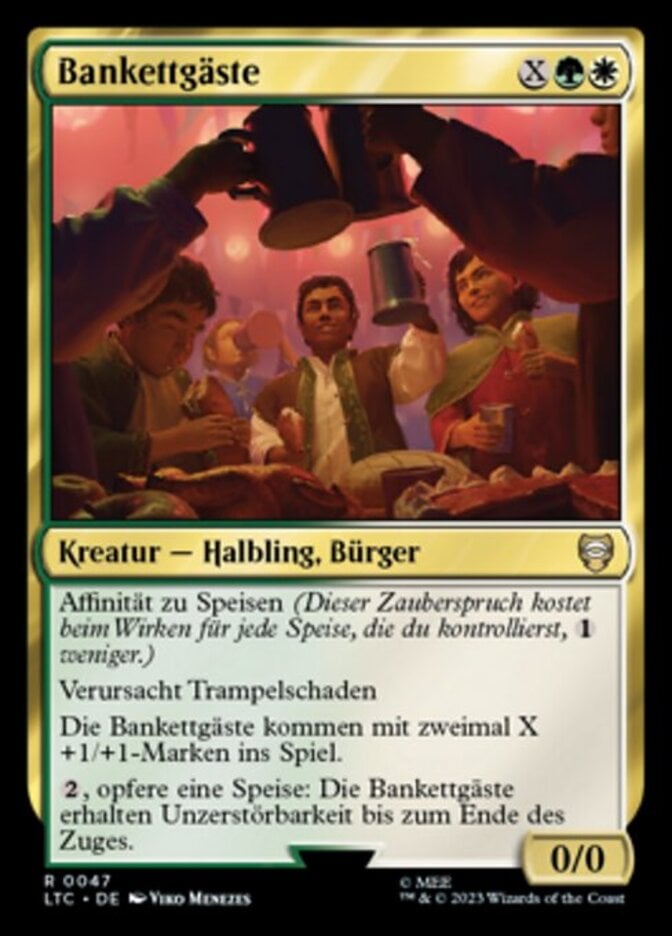 | Rules | Affinity for Food (This spell costs 1 less to cast for each Food you control.) Trample Banquet Guests enters the battlefield with twice X +1/+1 counters on it. , Sacrifice a Food: Banquet Guests gains indestructible until end of turn. |