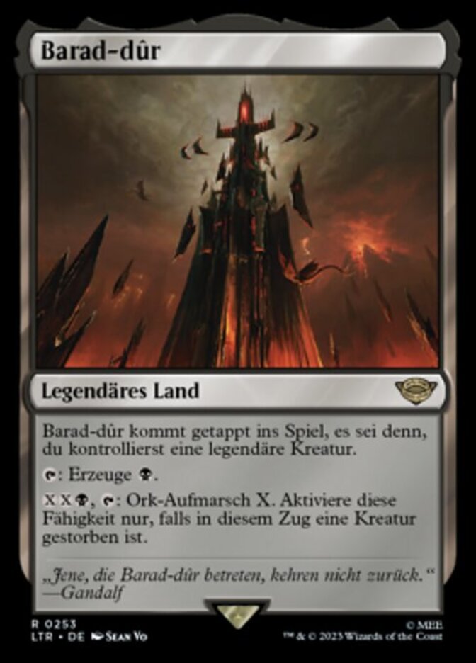 | Rules | Barad-dûr enters the battlefield tapped unless you control a legendary creature. : Add . , : Amass Orcs X. Activate only if a creature died this turn. |
