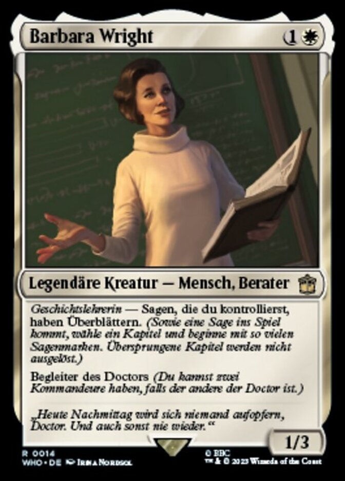| Rules | History Teacher — Sagas you control have read ahead. (As a Saga enters the battlefield, choose a chapter and start with that many lore counters. Skipped chapters don't trigger.) Doctor's companion (You can have two commanders if the other is the Doctor.) |