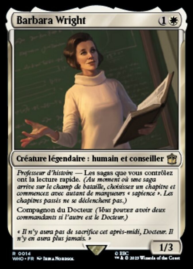 | Rules | History Teacher — Sagas you control have read ahead. (As a Saga enters the battlefield, choose a chapter and start with that many lore counters. Skipped chapters don't trigger.) Doctor's companion (You can have two commanders if the other is the Doctor.) |
