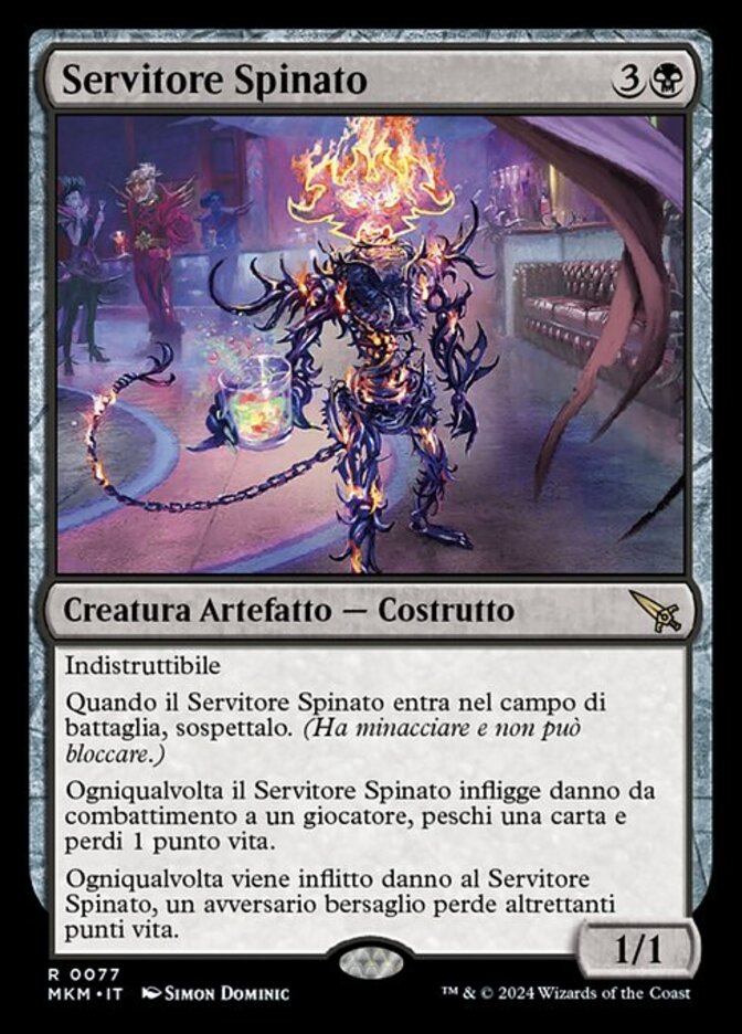 | Rules | Indestructible When Barbed Servitor enters the battlefield, suspect it. (It has menace and can't block.) Whenever Barbed Servitor deals combat damage to a player, you draw a card and you lose 1 life. Whenever Barbed Servitor is dealt damage, target opponent loses that much life. |