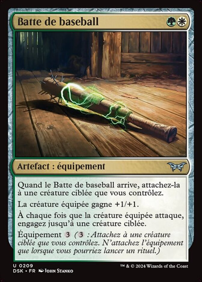 | Rules | When Baseball Bat enters, attach it to target creature you control. Equipped creature gets +1/+1. Whenever equipped creature attacks, tap up to one target creature. Equip (: Attach to target creature you control. Equip only as a sorcery.) |