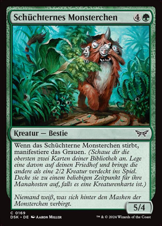 | Rules | When Bashful Beastie dies, manifest dread. (Look at the top two cards of your library. Put one onto the battlefield face down as a 2/2 creature and the other into your graveyard. Turn it face up any time for its mana cost if it's a creature card.) |