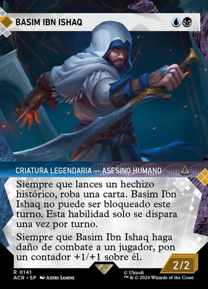| Rules | Whenever you cast a historic spell, draw a card. Basim Ibn Ishaq can't be blocked this turn. This ability triggers only once each turn. (Artifacts, legendaries, and Sagas are historic.) Whenever Basim Ibn Ishaq deals combat damage to a player, put a +1/+1 counter on it. |