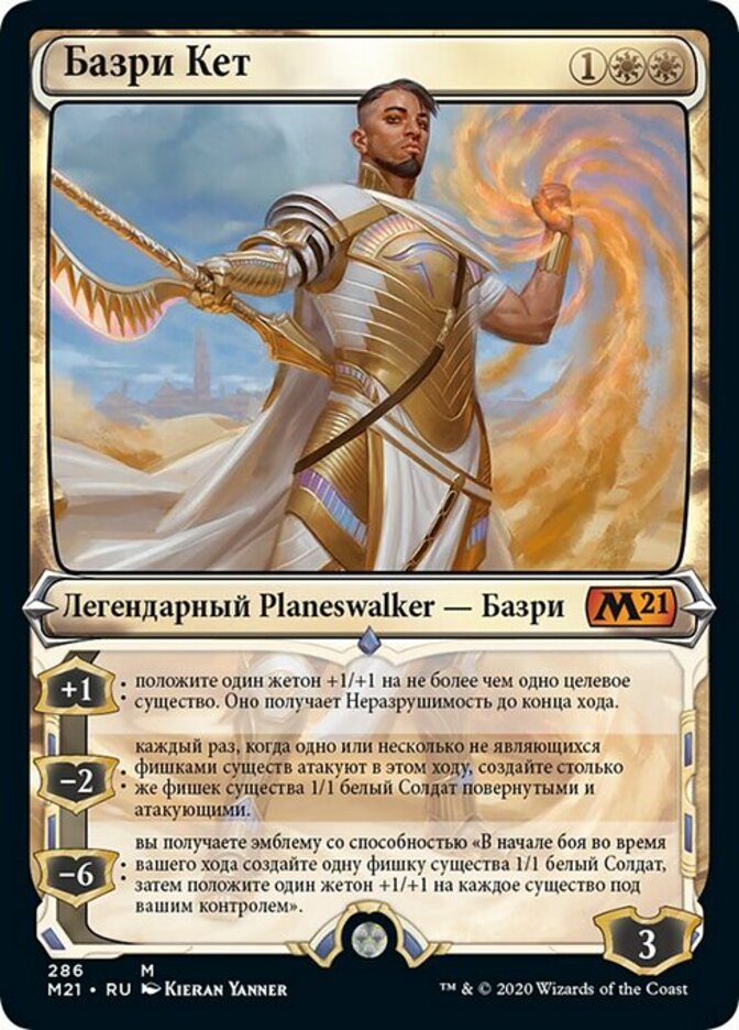 | Rules | +1: Put a +1/+1 counter on up to one target creature. It gains indestructible until end of turn. −2: Whenever one or more nontoken creatures attack this turn, create that many 1/1 white Soldier creature tokens that are tapped and attacking. −6: You get an emblem with "At the beginning of combat on your turn, create a 1/1 white Soldier creature token, then put a +1/+1 counter on each creature you control." |