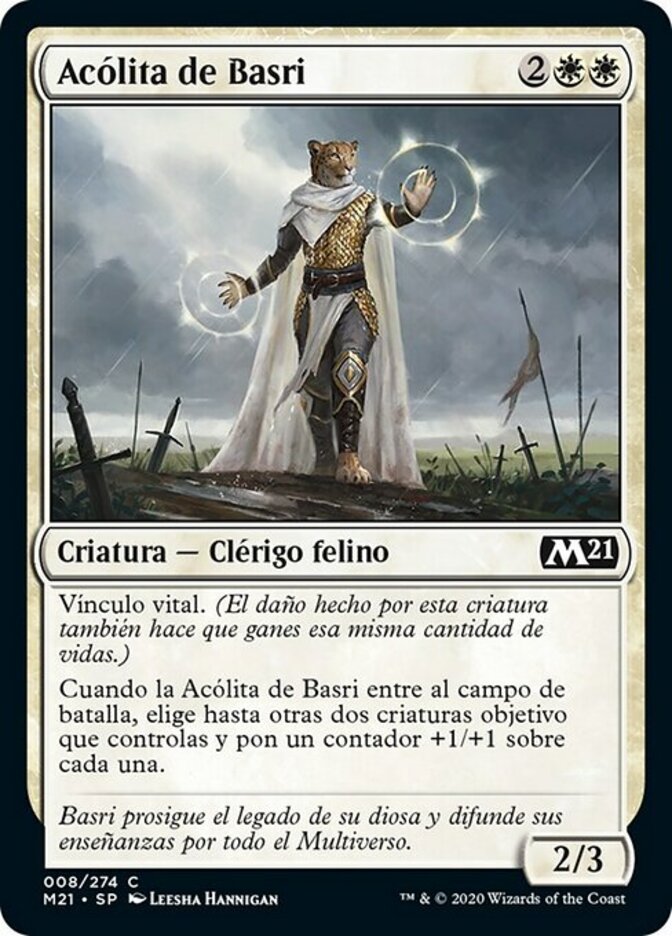 | Rules | Lifelink (Damage dealt by this creature also causes you to gain that much life.) When Basri's Acolyte enters the battlefield, put a +1/+1 counter on each of up to two other target creatures you control. |