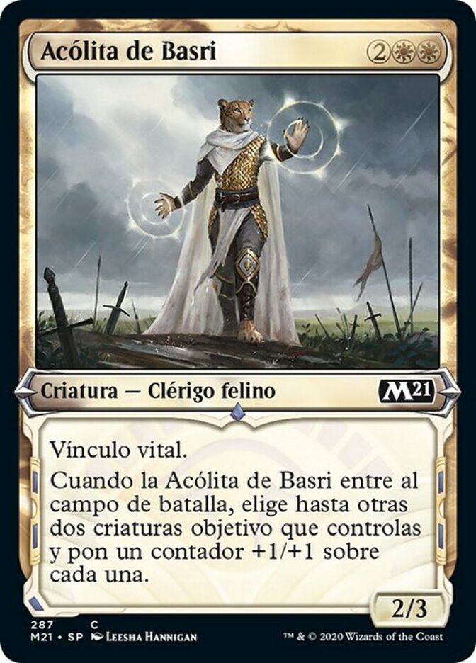 | Rules | Lifelink (Damage dealt by this creature also causes you to gain that much life.) When Basri's Acolyte enters the battlefield, put a +1/+1 counter on each of up to two other target creatures you control. |