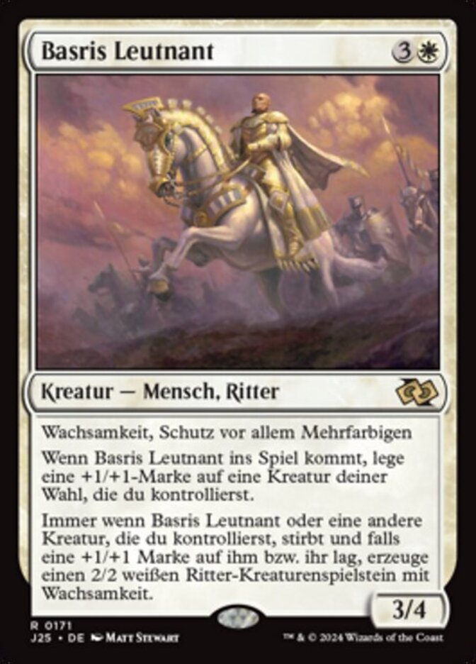| Rules | Vigilance, protection from multicolored When Basri's Lieutenant enters the battlefield, put a +1/+1 counter on target creature you control. Whenever Basri's Lieutenant or another creature you control dies, if it had a +1/+1 counter on it, create a 2/2 white Knight creature token with vigilance. |