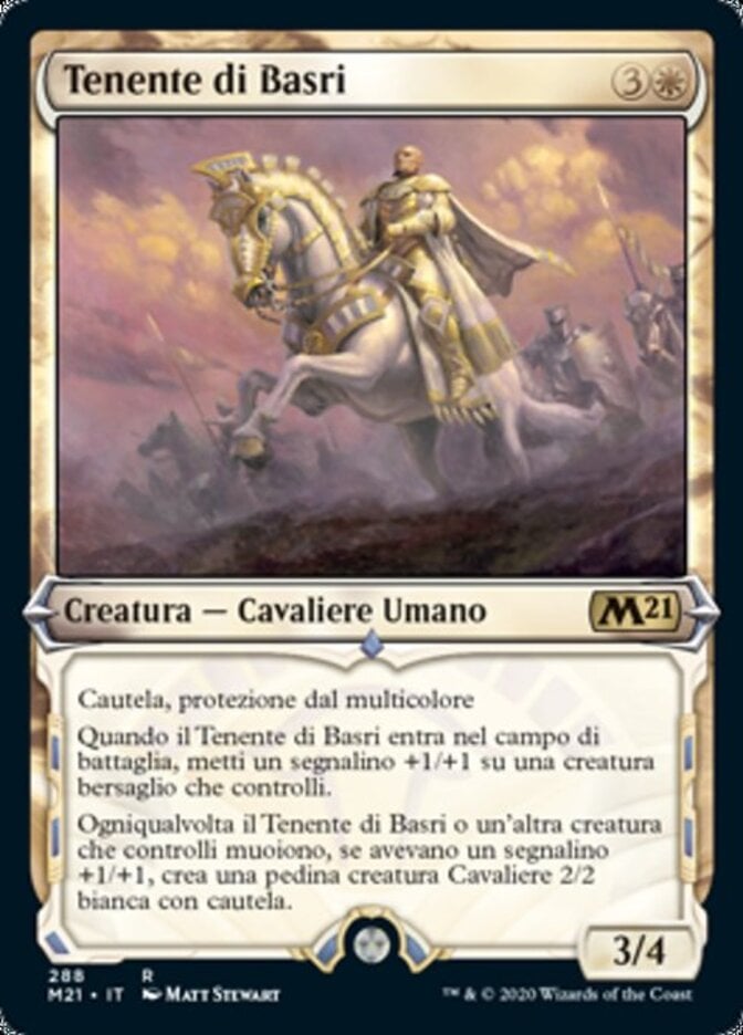 | Rules | Vigilance, protection from multicolored When Basri's Lieutenant enters the battlefield, put a +1/+1 counter on target creature you control. Whenever Basri's Lieutenant or another creature you control dies, if it had a +1/+1 counter on it, create a 2/2 white Knight creature token with vigilance. |