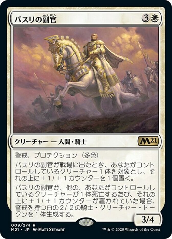 | Rules | Vigilance, protection from multicolored When Basri's Lieutenant enters the battlefield, put a +1/+1 counter on target creature you control. Whenever Basri's Lieutenant or another creature you control dies, if it had a +1/+1 counter on it, create a 2/2 white Knight creature token with vigilance. |
