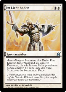 Rules Radiance — Choose a color. Target creature and each other creature that shares a color with it gain protection from the chosen color until end of turn.