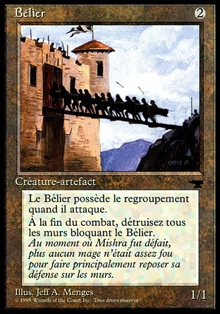 | Rules | At the beginning of combat on your turn, Battering Ram gains banding until end of combat. (Any creatures with banding, and up to one without, can attack in a band. Bands are blocked as a group. If any creatures with banding you control are being blocked by a creature, you divide that creature's combat damage, not its controller, among any of the creatures it's blocking.) Whenever Battering Ram becomes blocked by a Wall, destroy that Wall at end of combat. |