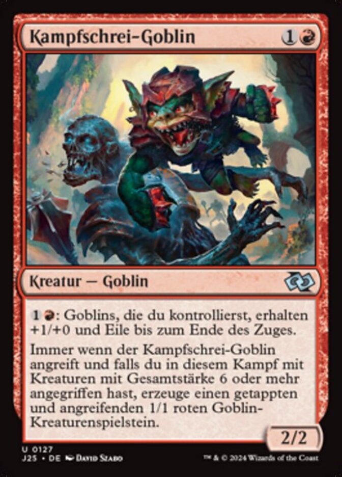 | Rules | : Goblins you control get +1/+0 and gain haste until end of turn. Pack tactics — Whenever Battle Cry Goblin attacks, if you attacked with creatures with total power 6 or greater this combat, create a 1/1 red Goblin creature token that's tapped and attacking. |