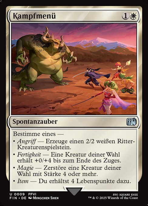 | Rules | Choose one — • Attack — Create a 2/2 white Knight creature token. • Ability — Target creature gets +0/+4 until end of turn. • Magic — Destroy target creature with power 4 or greater. • Item — You gain 4 life. |