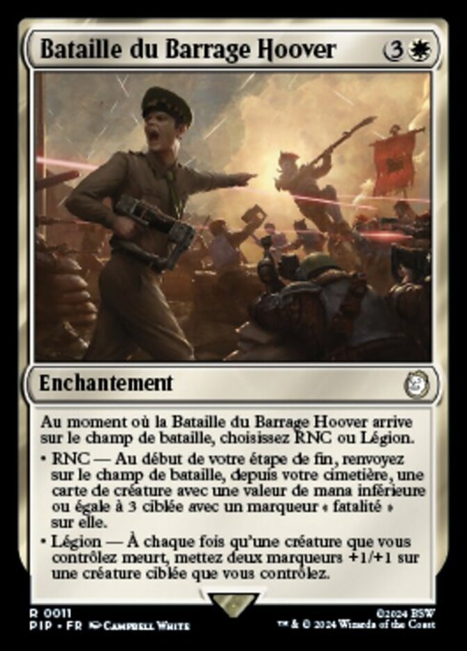 | Rules | As Battle of Hoover Dam enters the battlefield, choose NCR or Legion. • NCR — At the beginning of your end step, return target creature card with mana value 3 or less from your graveyard to the battlefield with a finality counter on it. • Legion — Whenever a creature you control dies, put two +1/+1 counters on target creature you control. |