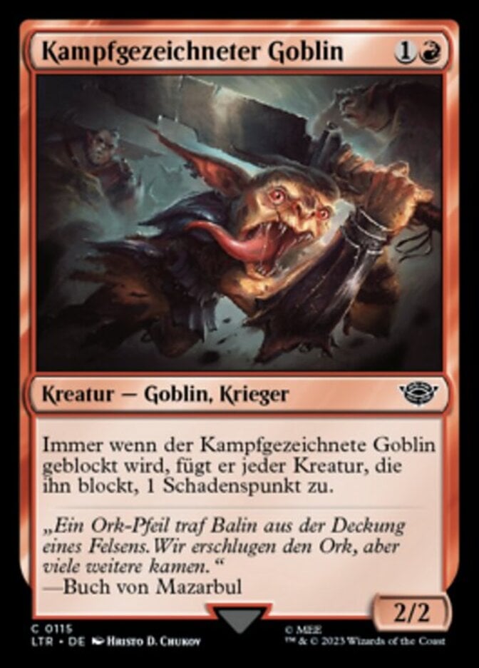 | Rules | Whenever Battle-Scarred Goblin becomes blocked, it deals 1 damage to each creature blocking it. |