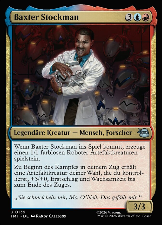 | Rules | When Baxter Stockman enters, create a 1/1 colorless Robot artifact creature token. At the beginning of combat on your turn, target artifact creature you control gets +3/+0 and gains first strike and vigilance until end of turn. |