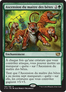 | Rules | Whenever a creature you control attacks, you may put a quest counter on Beastmaster Ascension. As long as Beastmaster Ascension has seven or more quest counters on it, creatures you control get +5/+5. |