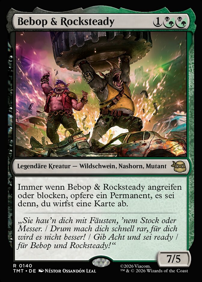 | Rules | Whenever Bebop & Rocksteady attack or block, sacrifice a permanent unless you discard a card. |