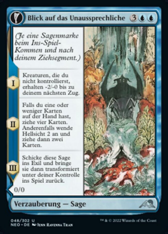 | Rules | (As this Saga enters and after your draw step, add a lore counter.) I — Creatures you don't control get -2/-0 until your next turn. II — If you have one or fewer cards in hand, draw four cards. Otherwise, scry 2, then draw two cards. III — Exile this Saga, then return it to the battlefield transformed under your control. // Flying, trample Vision of the Unspeakable gets +1/+1 for each card in your hand. |
