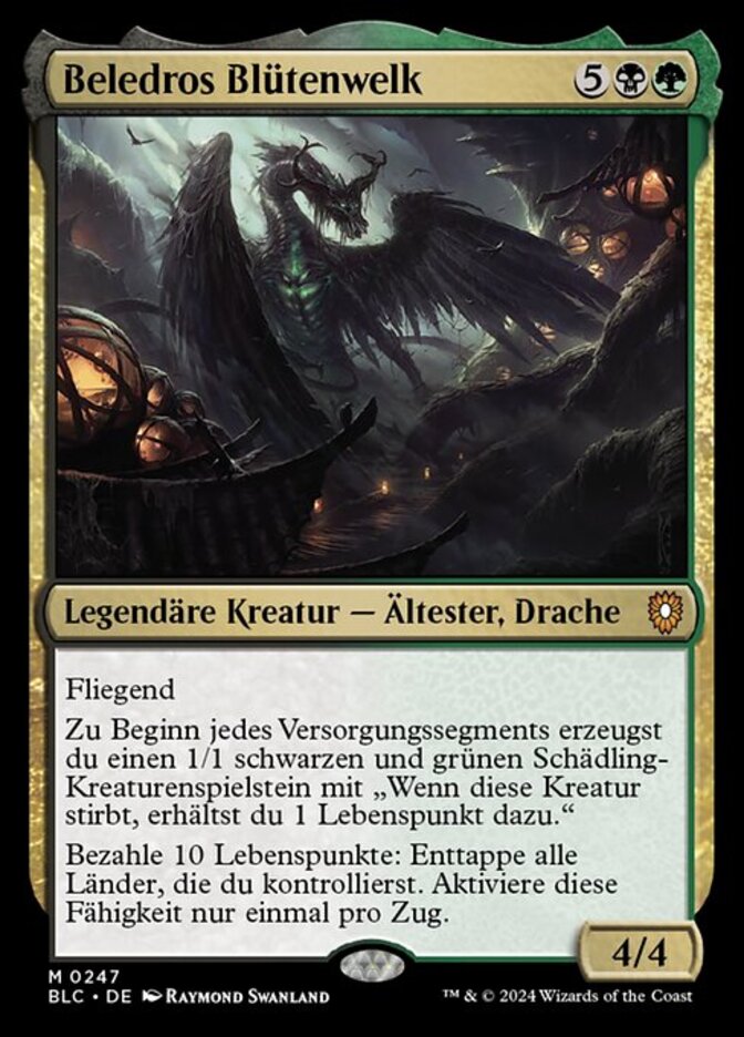 | Rules | Flying At the beginning of each upkeep, create a 1/1 black and green Pest creature token with "When this creature dies, you gain 1 life." Pay 10 life: Untap all lands you control. Activate only once each turn. |