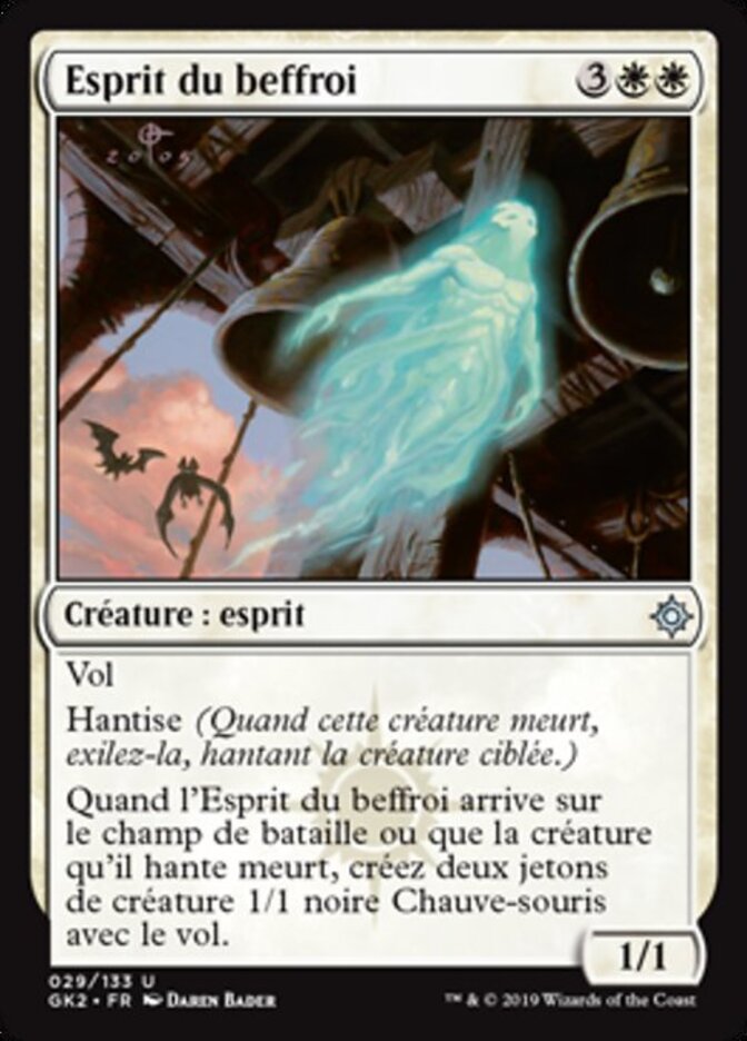 | Rules | Flying Haunt (When this creature dies, exile it haunting target creature.) When Belfry Spirit enters the battlefield or the creature it haunts dies, create two 1/1 black Bat creature tokens with flying. |