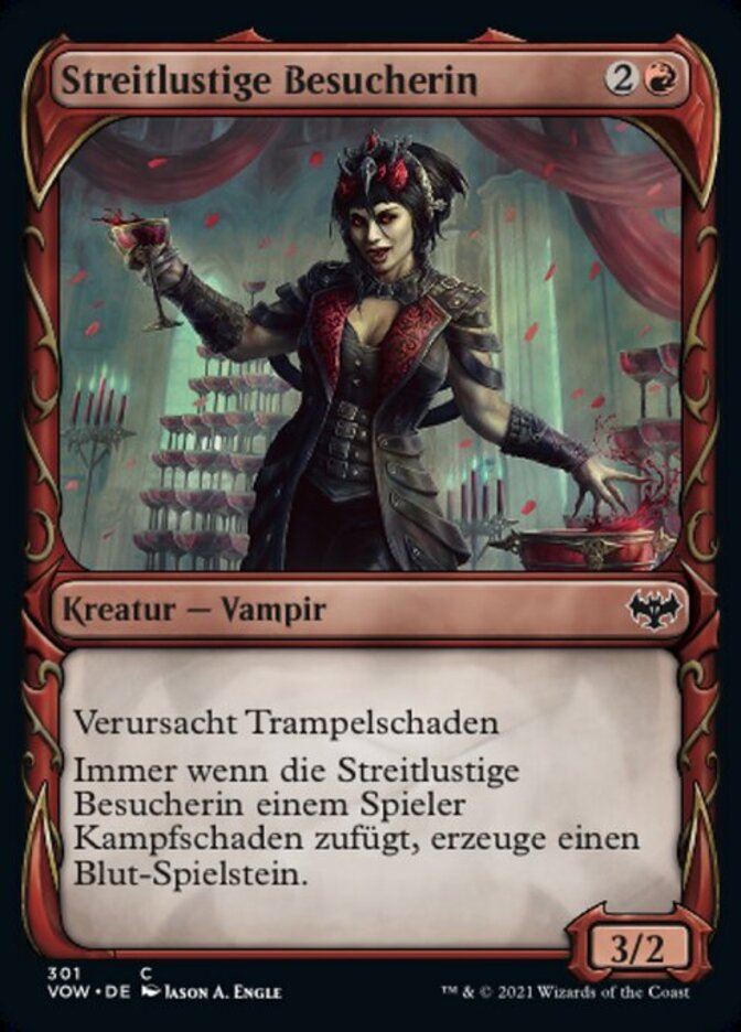| Rules | Trample Whenever Belligerent Guest deals combat damage to a player, create a Blood token. (It's an artifact with ", , Discard a card, Sacrifice this artifact: Draw a card.") |