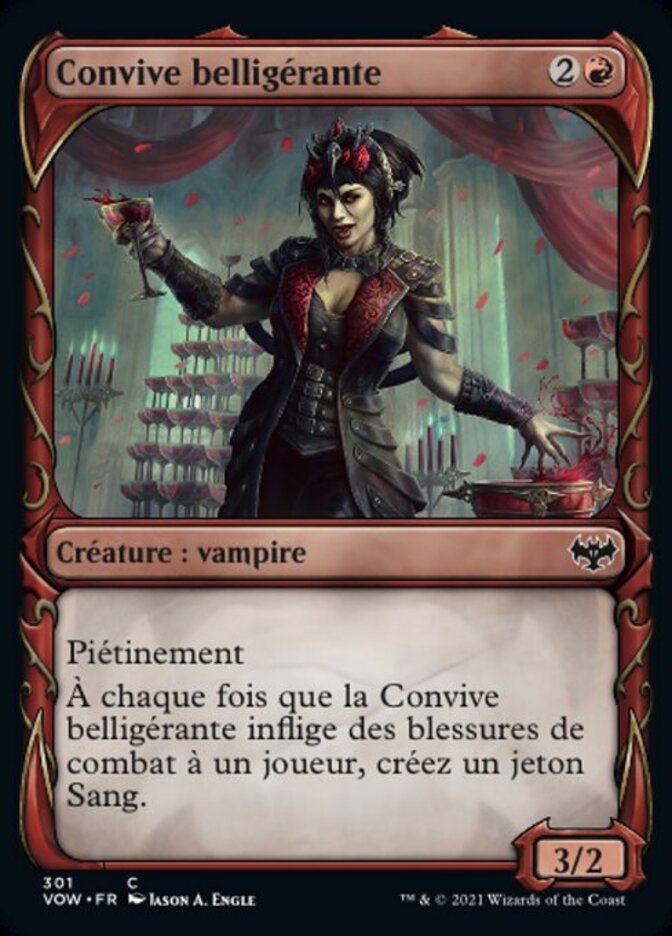 | Rules | Trample Whenever Belligerent Guest deals combat damage to a player, create a Blood token. (It's an artifact with ", , Discard a card, Sacrifice this artifact: Draw a card.") |