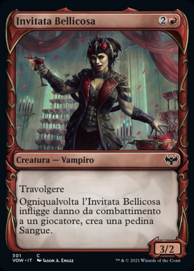 | Rules | Trample Whenever Belligerent Guest deals combat damage to a player, create a Blood token. (It's an artifact with ", , Discard a card, Sacrifice this artifact: Draw a card.") |
