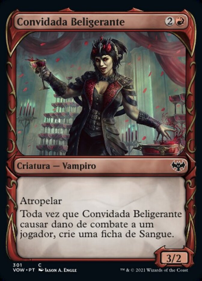 | Rules | Trample Whenever Belligerent Guest deals combat damage to a player, create a Blood token. (It's an artifact with ", , Discard a card, Sacrifice this artifact: Draw a card.") |