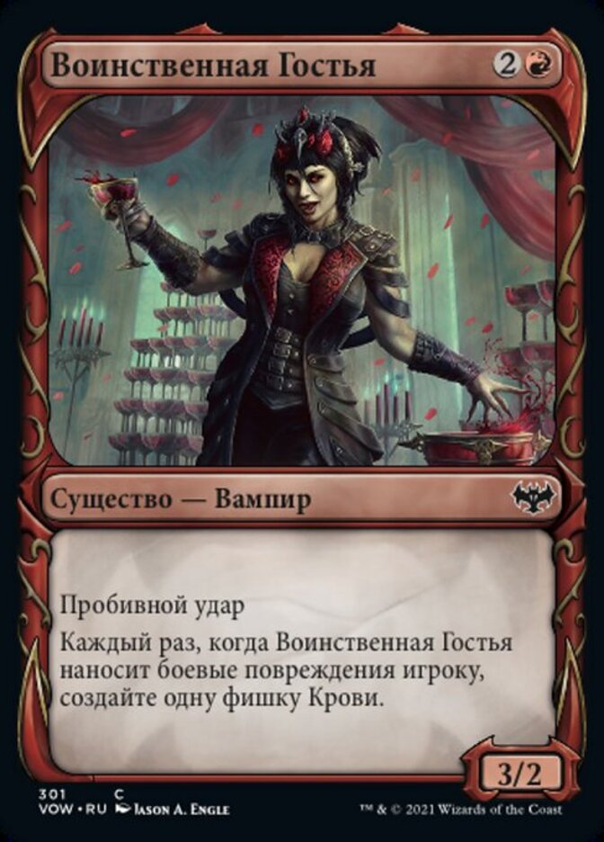 | Rules | Trample Whenever Belligerent Guest deals combat damage to a player, create a Blood token. (It's an artifact with ", , Discard a card, Sacrifice this artifact: Draw a card.") |