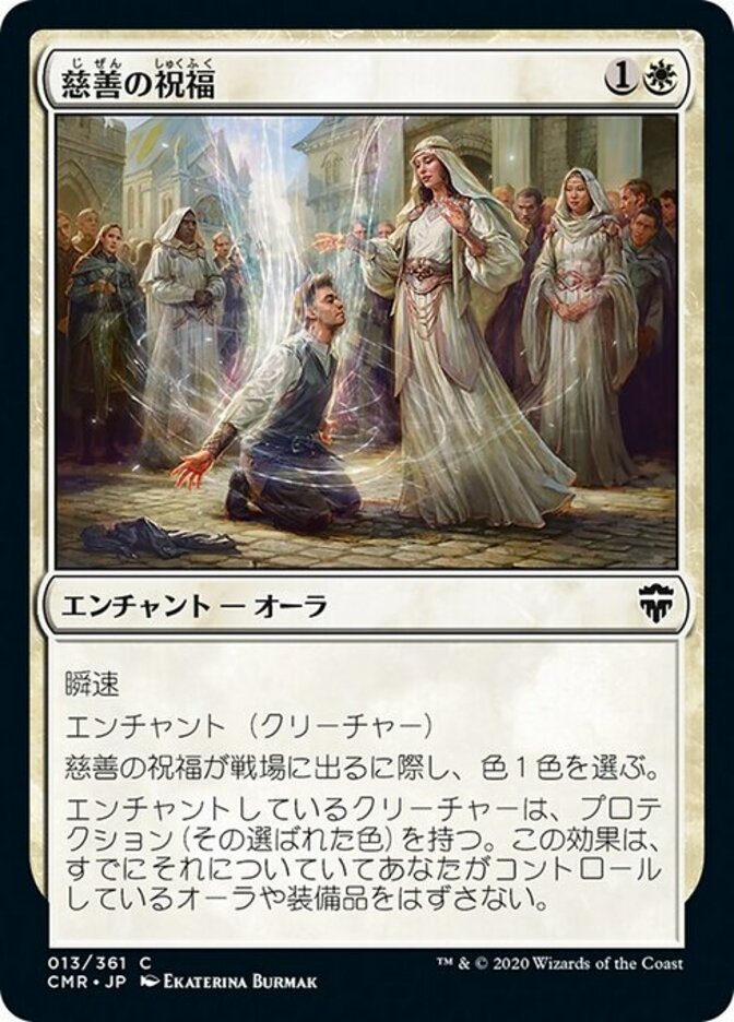 | Rules | Flash Enchant creature As Benevolent Blessing enters the battlefield, choose a color. Enchanted creature has protection from the chosen color. This effect doesn't remove Auras and Equipment you control that are already attached to it. |
