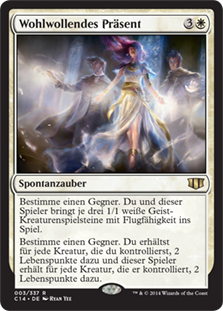 | Rules | Choose an opponent. You and that player each create three 1/1 white Spirit creature tokens with flying. Choose an opponent. You gain 2 life for each creature you control and that player gains 2 life for each creature they control. |