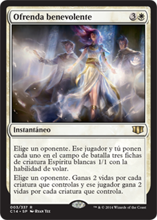 | Rules | Choose an opponent. You and that player each create three 1/1 white Spirit creature tokens with flying. Choose an opponent. You gain 2 life for each creature you control and that player gains 2 life for each creature they control. |