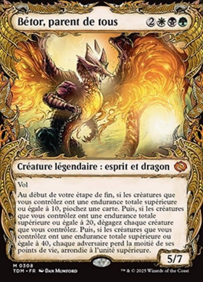 | Rules | Flying At the beginning of your end step, if creatures you control have total toughness 10 or greater, draw a card. Then if creatures you control have total toughness 20 or greater, untap each creature you control. Then if creatures you control have total toughness 40 or greater, each opponent loses half their life, rounded up. |