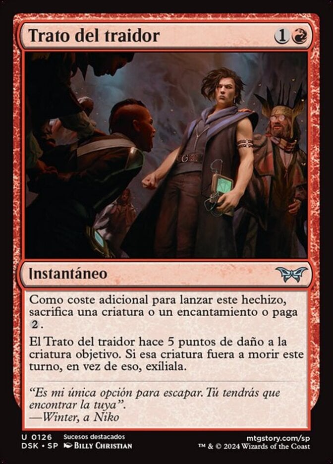 | Rules | As an additional cost to cast this spell, sacrifice a creature or enchantment or pay . Betrayer's Bargain deals 5 damage to target creature. If that creature would die this turn, exile it instead. |