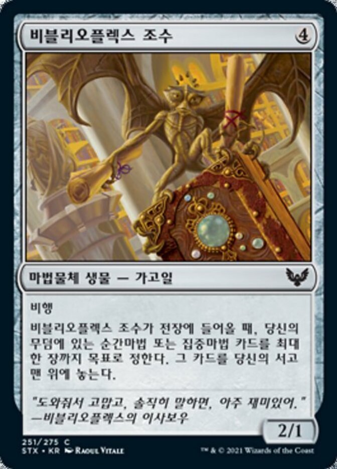 | Rules | Flying When Biblioplex Assistant enters the battlefield, put up to one target instant or sorcery card from your graveyard on top of your library. |