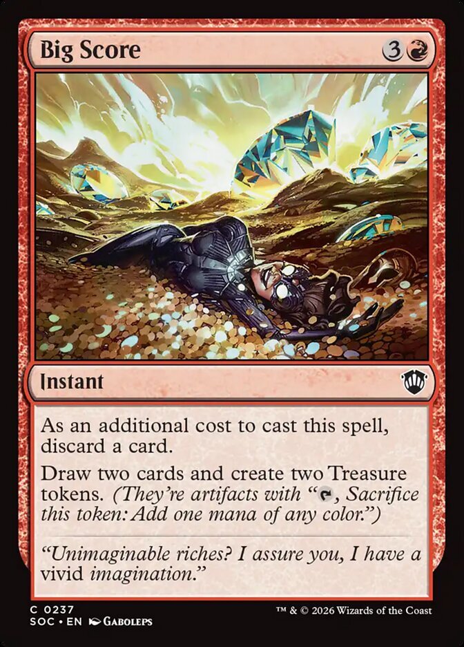 | Rules | As an additional cost to cast this spell, discard a card. Draw two cards and create two Treasure tokens. (They're artifacts with ", Sacrifice this artifact: Add one mana of any color.") |