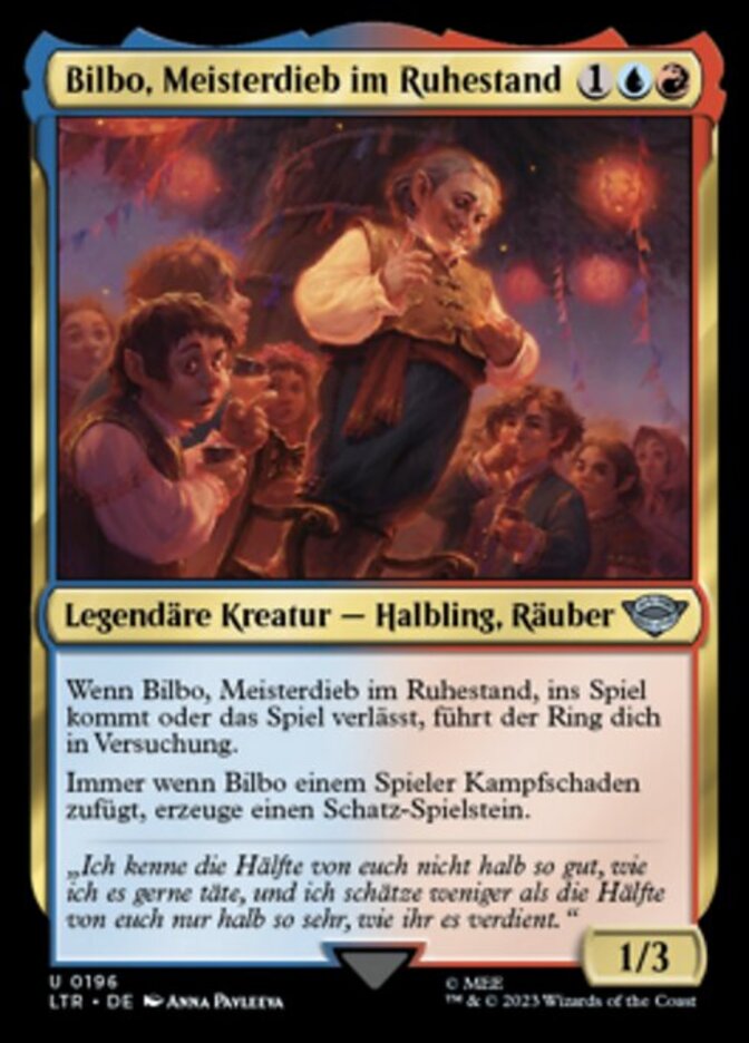 | Rules | When Bilbo, Retired Burglar enters or leaves the battlefield, the Ring tempts you. Whenever Bilbo deals combat damage to a player, create a Treasure token. |