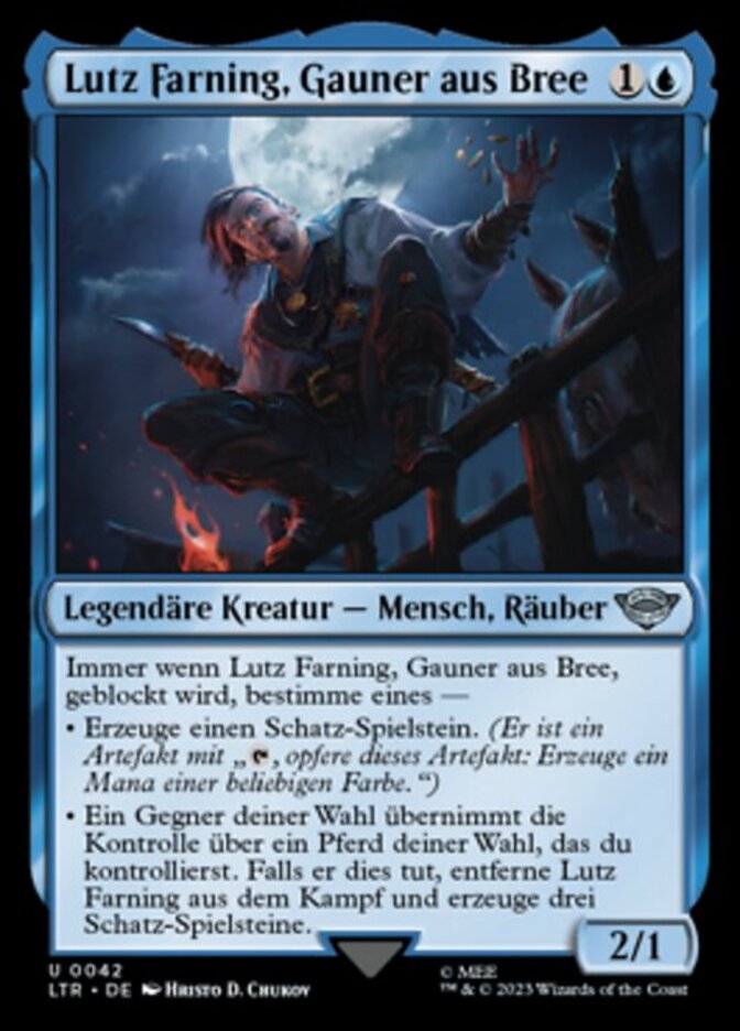 | Rules | Whenever Bill Ferny, Bree Swindler becomes blocked, choose one — • Create a Treasure token. (It's an artifact with ", Sacrifice this artifact: Add one mana of any color.") • Target opponent gains control of target Horse you control. If they do, remove Bill Ferny from combat and create three Treasure tokens. |