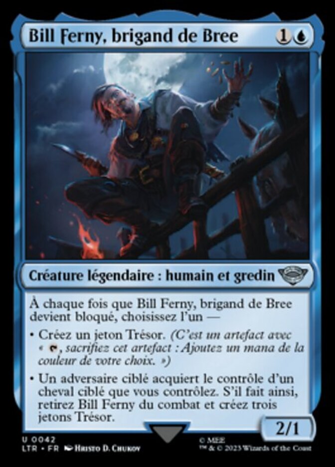 | Rules | Whenever Bill Ferny, Bree Swindler becomes blocked, choose one — • Create a Treasure token. (It's an artifact with ", Sacrifice this artifact: Add one mana of any color.") • Target opponent gains control of target Horse you control. If they do, remove Bill Ferny from combat and create three Treasure tokens. |