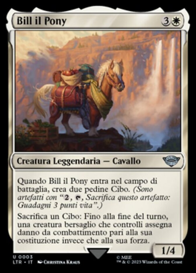 | Rules | When Bill the Pony enters the battlefield, create two Food tokens. (They're artifacts with ", , Sacrifice this artifact: You gain 3 life.") Sacrifice a Food: Until end of turn, target creature you control assigns combat damage equal to its toughness rather than its power. |