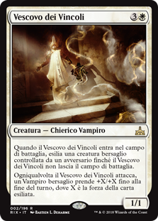 | Rules | When Bishop of Binding enters the battlefield, exile target creature an opponent controls until Bishop of Binding leaves the battlefield. Whenever Bishop of Binding attacks, target Vampire gets +X/+X until end of turn, where X is the power of the exiled card. |