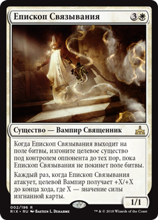 | Rules | When Bishop of Binding enters the battlefield, exile target creature an opponent controls until Bishop of Binding leaves the battlefield. Whenever Bishop of Binding attacks, target Vampire gets +X/+X until end of turn, where X is the power of the exiled card. |