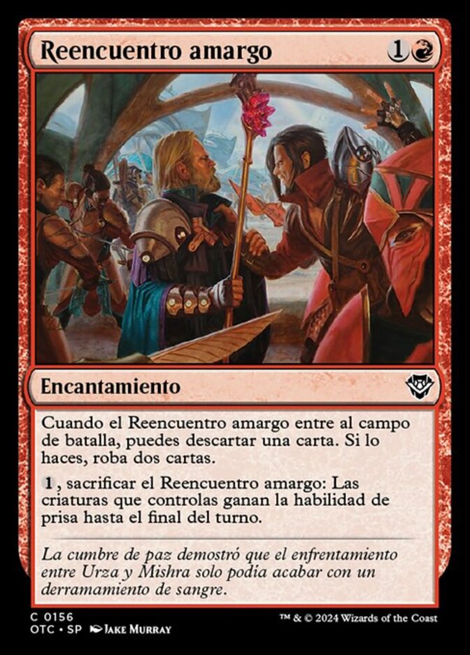 | Rules | When Bitter Reunion enters the battlefield, you may discard a card. If you do, draw two cards. , Sacrifice Bitter Reunion: Creatures you control gain haste until end of turn. |
