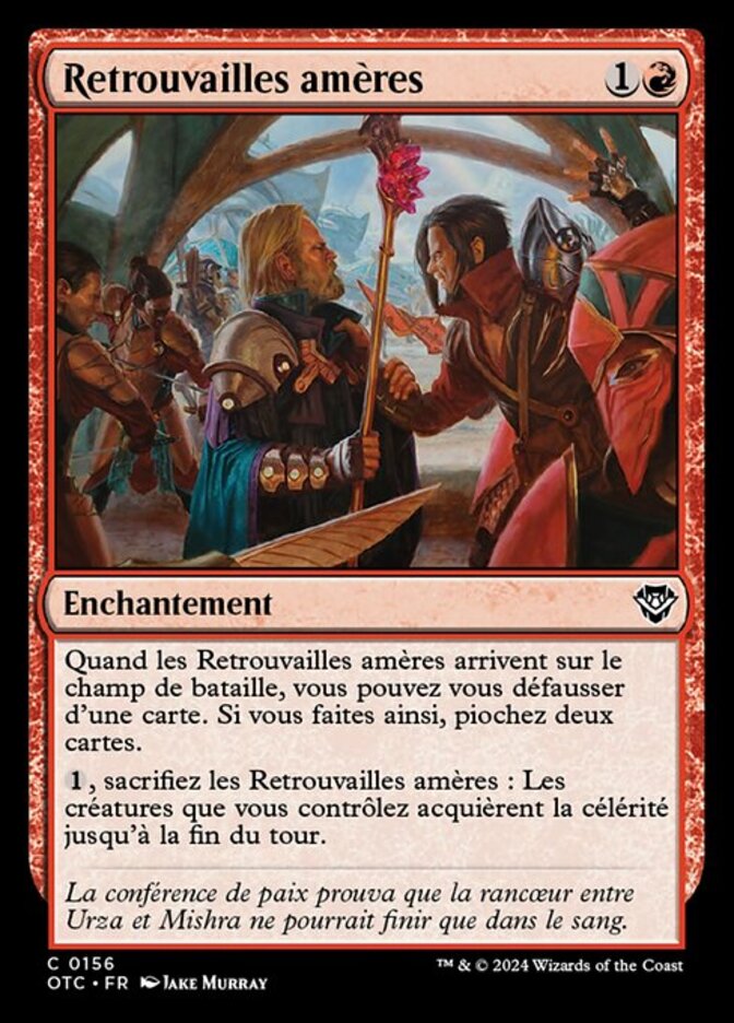 | Rules | When Bitter Reunion enters the battlefield, you may discard a card. If you do, draw two cards. , Sacrifice Bitter Reunion: Creatures you control gain haste until end of turn. |